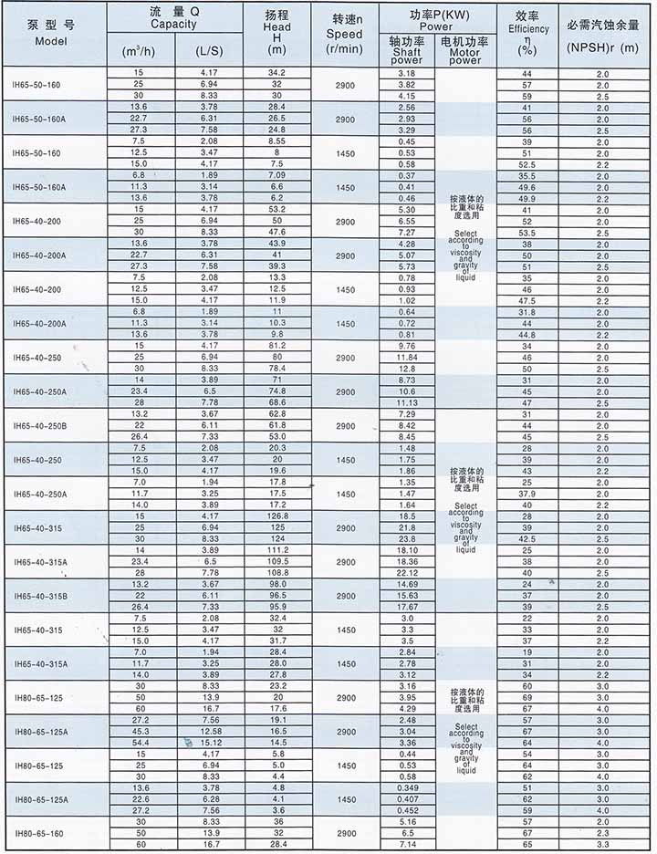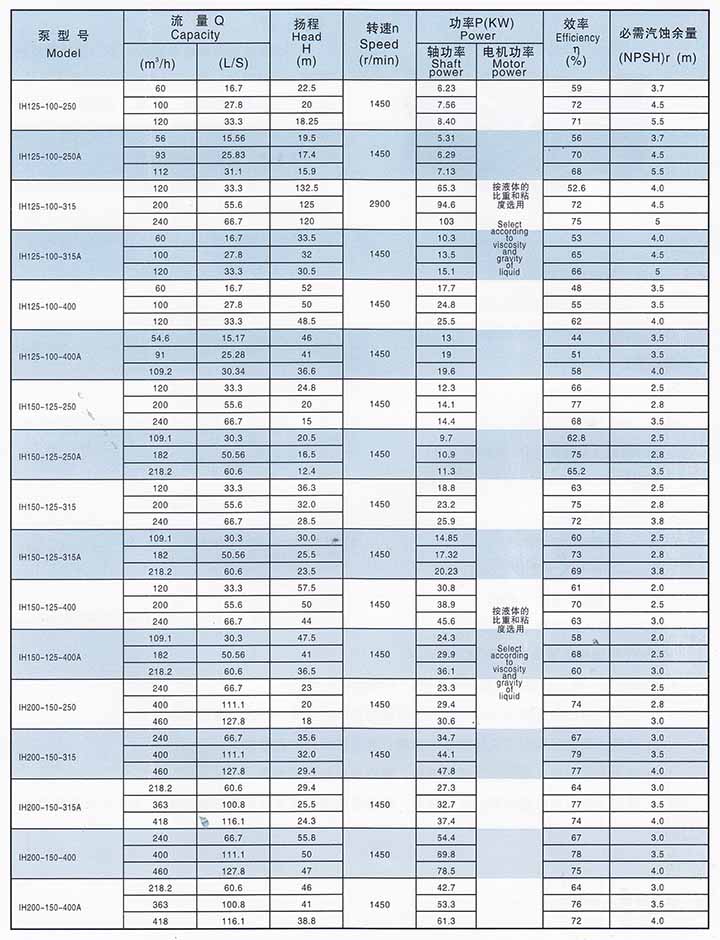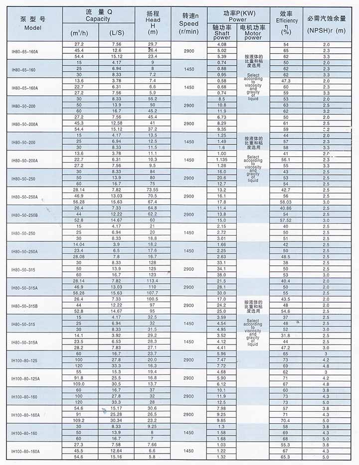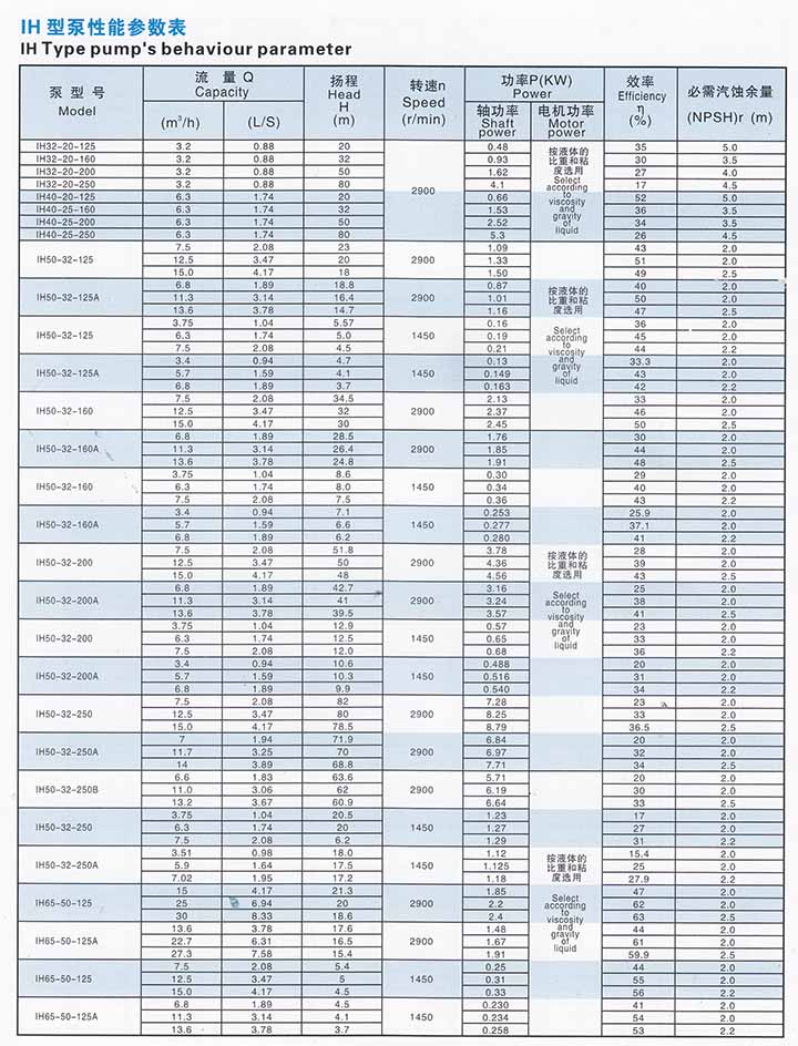 概述: IH型泵是單級單吸(軸向吸入)耐腐蝕離心泵,供輸送不含固體顆粒、具有腐蝕性、粘度類似水的液體。介質(zhì)溫度為-20℃~105℃,需要時采用冷卻措施溫度可更高。適用于石油、化工、冶金、電力、造紙、食品、制藥和合成纖維等部門。 性能范圍: 流量Q 0.3-400m3/h 配帶功率0.55-90kw 揚程H 5-125mm 進口直徑32-200mm 轉(zhuǎn)速n 2900、1450r/min 最高工作壓力1.6MPa IH型泵是全國泵行業(yè)采用ISO2858國際標準聯(lián)合設(shè)計的系列產(chǎn)品,具有性能范圍廣,效率高、“三化”水平高和維修方便等特點。 IH型系列泵有40個基本型,其中33個雙速(2900、1450r/min)經(jīng)過A、B兩種型式的葉輪直徑切割變型后,達112個規(guī)格。